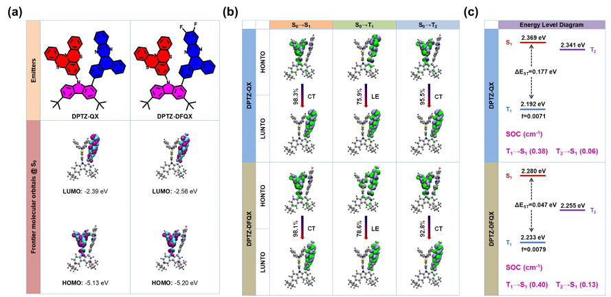 通过重原子效应调控分子的光物理特性一直是开发有机发光材料和金属有机发光材料的一个有趣的课题。为了提高纯有机热活化延迟荧光(TADF)材料的RISC速率,引入SOC常数更大的S或者Se原子是一个流行的分子设计策略。然而较重的S原子的存在并不一定会改善材料的TADF性能,并且由于其独特的电子和几何性质,可能从不同方面对TADF的光物理性质产生影响。一方面是S原子较大的半径可能导致扭曲的分子构型。另一方面,S原子不同的电子效应也会改变分子激发态的能级。因此,含S发光分子在电子效应、几何结构变化和重原子效应的多种影响下,其激发态特性调控既复杂又有趣。由于空间电荷转移(TSCT)激发态严重依赖于给/受体单元的几何结构和电子结构,因此研究S原子取代O原子对TSCT-TADF发光性能的影响是十分必要的。